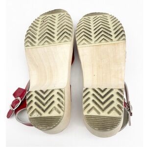 This is the spring/summer shoe to have. This is Europe made wood heel red leather and fits so many styles Modern but yet fits vintage styles. Works well with wide le pants and long flowy skirts. There is some wear on heel but please see pics for more detail. Brand new would cost over $100. Elevate your style with these chic red leather mules. Designed for comfort and elegance, they are perfect for any occasion.