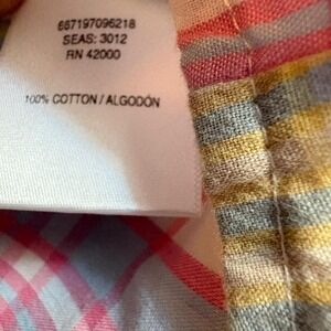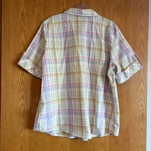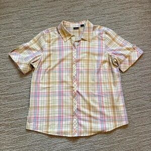 Basic Editions shirt button up short sleeve plaid yellow pink cotton women XL