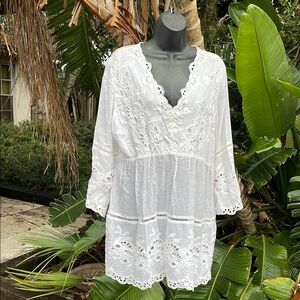 this pretty dress is a cotton with embroidery around holes, which is cut Work. It’s a little different than eyelet but along that line. This is a light cotton with a bell sleeve. In excellent condition knew whith tags.