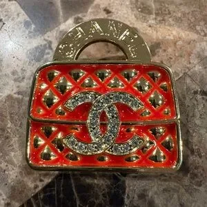 Elegant CHANEL brooch with gold and red quilted design. Features iconic logo with sparkling details.