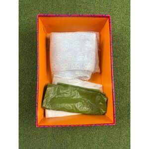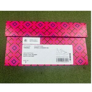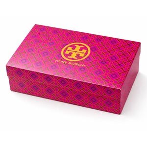 Authentic Tory Burch original shoe box for Good Luck Trainer Nappa Leather, Style 158826, Color Stone Grey 250, Size US 7. branded tissue paper, silica packets, and original insert card. This listing is for the empty branded box only. Exterior features Tory Burch signature geometric logo pattern in vibrant pink, magenta, and red with gold logo emblem. Interior is bright orange with original structure intact. Box measures approximately 12.5 in L x 8.5 in W x 4.5 in H (31 x 21 x 11.5 cm). Condition is pre-owned with light wear from storage including minor corner scuffing, slight edge creasing, and small surface marks as shown in photos. No major tears or structural damage. Includes original silica packets. Ideal for collectors, resale presentation, storage, gift packaging, display, or replacing a damaged original box. Clean interior, sturdy build, vibrant color retention. Great for fashion collectors or boutique resale packaging.