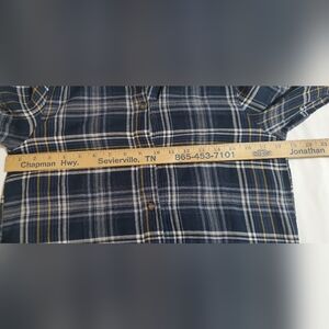 Chic navy plaid dress with button-up design. Wear as a dress or use as long shirt layered with jeans. Ideal for casual wear. In good used condition.
