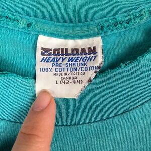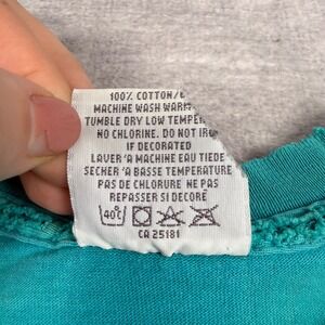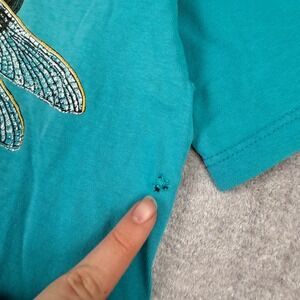 Brand: Gildan Material: 100% Cotton Color: Teal Graphic: Dragonfly Wetland Wilderness Sleeve Length: Short Sleeve Neckline: Crew Neck Country of Manufacture: Canada Stitching: Double Stitch (Sleeves/Hem) Fit: Regular Theme: Nature, Environmental, Animals Era: 1990s Distressing: Distressed Collar, Small Holes, Faint Staining Keywords: Gorpcore, Naturecore, Environmentalist, Dragonfly, 90s Vintage, Earthy, Distressed, Thrashed, Boho, Hippie, Cabin, Wilderness, Wetland, Animal Graphic, Sustainable Style This item is in fair condition with visible distressing, including fraying at the neckline, small holes near the underarms/side seams, and faint dark spots on the front and shoulders as shown in photos.