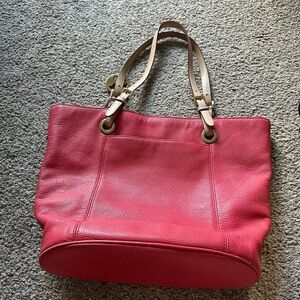 Elegant Michael Kors tote in rich raspberry leather. Features dual handles and signature charm. Perfect for daily essentials.