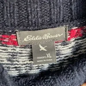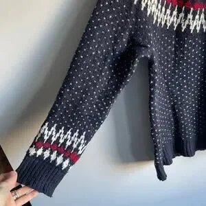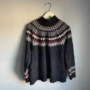 This is a stylish Eddie Bauer Fair Isle sweater in excellent condition. It is a navy blue wool blend and features a comfortable mock neck design. Perfect for staying warm and fashionable during the colder months!