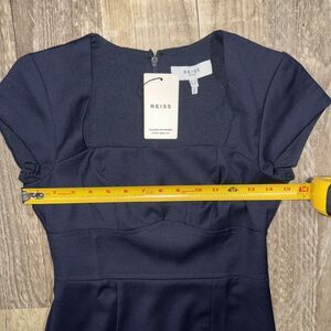 Reiss Dress in Petite 2P size is a stylish and elegant navy blue sheath dress perfect for various occasions such as weddings, parties, workwear, and business events. Made from a blend of polyester and wool, this knee-length dress features a square neckline, zip closure, and cap sleeves, adding a touch of sophistication to your wardrobe. With a classic and designer theme, this dress is both timeless and versatile, making it a great addition to your collection for all seasons.