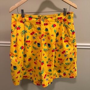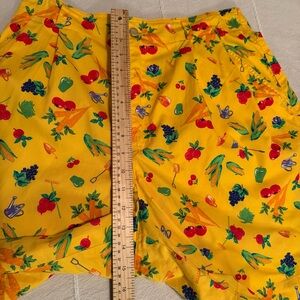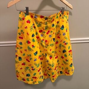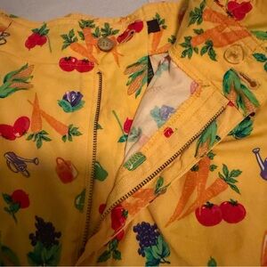 Vintage 90s Lizsport novelty print skirt featuring a colorful vegetable and garden motif on bright yellow cotton. Classic pleated silhouette with pockets and button closure. Lightweight and breathable — perfect for cottagecore, retro summer styling, teacher outfits, or whimsical fashion lovers. • Vintage 1990s • Size 14 • 100% cotton • Pleated front • Side pockets • Excellent pre-owned condition Measurements shown in photos.