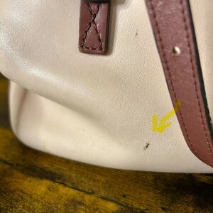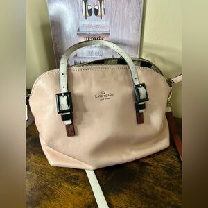 Chic pink satchel with brown handles. Elegant design. Perfect for everyday use.