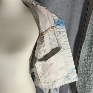 Trendy jean jacket with multicolor tie-dye. Features button front and classic collar. Ideal for casual wear.