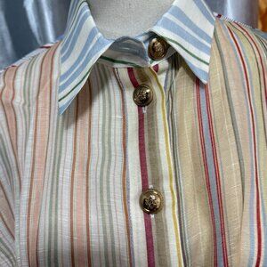 The Rebellion Striped Midi Dress in Spliced Stripes from our Cruise 2026 Collection, Twisted Romance. A silk-linen midi dress featuring a classic collar, buttons down the centre front, long billow sleeves with exaggerated cuffs, finished with a wrap waist belt tied to one side.