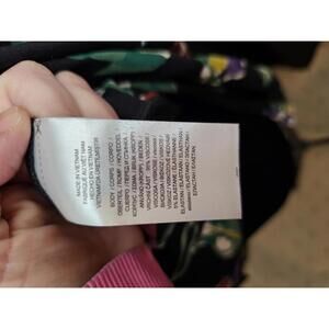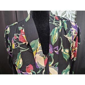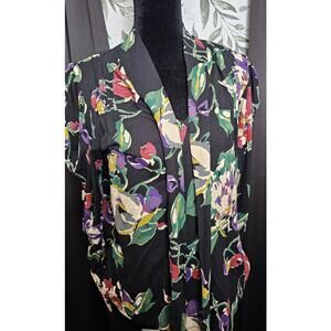 Women's blouse featuring a vibrant floral print on a black background.