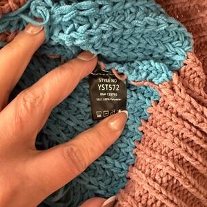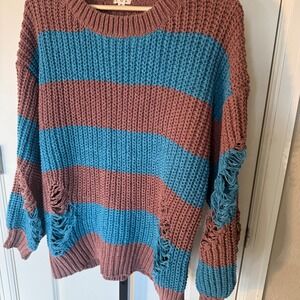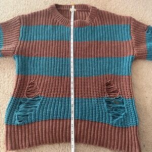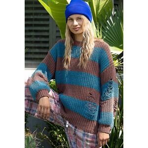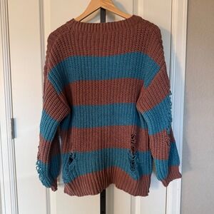 POL Distressed Striped Oversized Chunky Knit Sweater Brown Teal Womens S