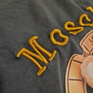 Stylish Moschino t-shirt featuring embroidered name and accents, as well as a cute bear graphic with text stating "This is not a Moschino Toy". Pre-Owned; Please note, regular wear and tear is normal as these are vintage and or used pieces. I do my best to identify any flaws or issues that they may have. If you have any questions or concerns, don't hesitate to reach out. Sizing: Pit to pit 18" Shoulder seam to bottom 24" Neck Cuff 7" Arm Length 8" *Be aware that this tee is missing the collar tag as seen in photos. As well that the shirt shows signs of wear due to age such as cracking/fraying and a small hole along the embroidery (as seen in attached photos)* All products are machine washed with non-scented detergent/sheets. Feel free to shoot me an offer if you're not quite feeling the listing price & thank you for your interest!