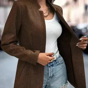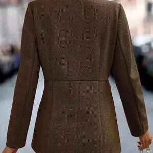 Coffee Brown Casual Women's Herringbone Pattern Long Sleeve Overcoat