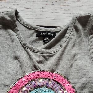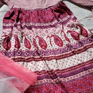 Adorable pink and gray dress with a rainbow design and tutu skirt. Has a small hole as seen on picture, but hardly worn. The other one is brand new without tags. Color is white and burgundy with bell sleeves. Perfect for playful occasions.