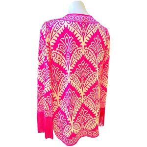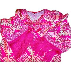 Flying Tomato Pink and Cream Patterned Tunic wide Fringed Sleeves