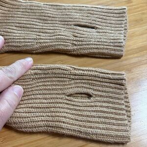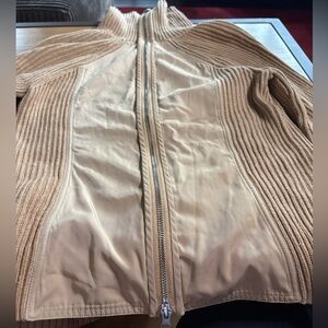 Camel color knit (55% Acrylic, 455 Cotton) with woven back panel. Sweater. Long sleeves. High neckline. Exposed back zipper closure.