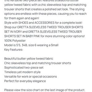 Brighten your wardrobe with this stylish yellow sleeveless tweed trouser short set. Perfect for any occasion, it offers comfort and elegance.