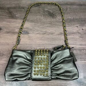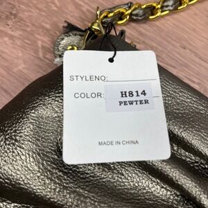 Keywords: Metallic, Rocker, Edgy, Glam, Night Out, Cocktail, Y2K Aesthetic, Studded Bag, Pewter Purse, Chain Link Strap, Hananel Handbag, Evening Clutch