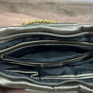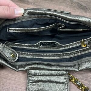 Pewter metallic faux leather handbag features a distinctive gathered bow-like silhouette accented by a central flap with gold-tone dome studs. The interior is lined with black fabric and includes multiple organizational compartments, including a zippered pocket and slip pockets, secured by a top zip closure. A gold-tone chain strap interwoven with matching pewter material allows for comfortable shoulder wear, while the detachable hardware offers versatile styling options.