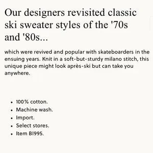 "Our designers revisited classic ski sweater styles of the '70s and '80s which were revived and popular with skateboarders in the ensuing years. Knit in a soft-but-sturdy milano stitch, this unique piece might look après-ski but can take you anywhere."