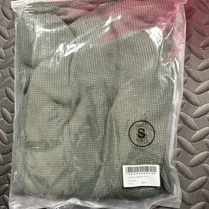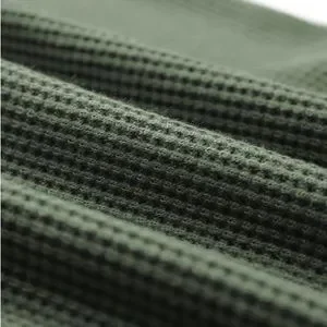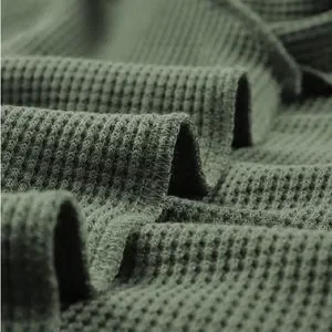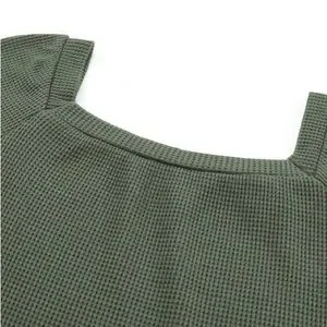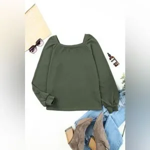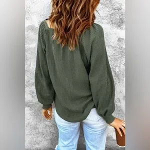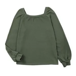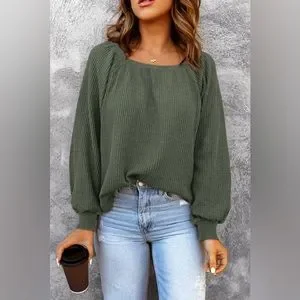 New - Shewin - Green Plain Waffle Knit Bishop Sleeve Square Neck Top