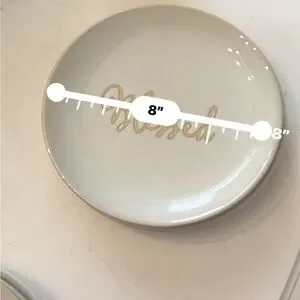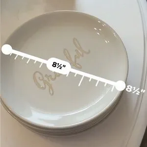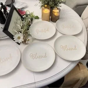 Charming cream plate with 'Grateful' and “Blessed” script by BETTER HOMES AND GARDENS. Beautifully neutral colors and high quality for dressing up or down make this an Ideal staple for any dining setting. 5 pieces. 2 Grateful and 3 Blessing. Dimensions in pictures. Bring any offers.