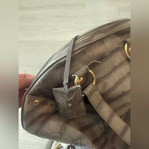 The YSL Muse Embossed Croc Suede with Leather Large Handbag is a stylish and luxurious accessory designed for women by the renowned brand Saint Laurent. Made with high-quality leather, this satchel/top handle bag features a gray exterior with intricate crocodile suede embossing. The large size offers ample space for storing essentials, while the leather handle/strap adds a touch of sophistication to the overall design. This handbag exudes elegance and sophistication, making it a perfect choice for women looking to add a touch of glam to their ensemble.