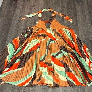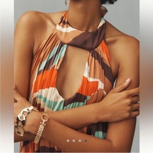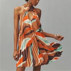 NWT Anthropologie (L) Hutch Halter Pleated Mini Dress. Side zip, flowing, lined, halter tie with keyhole in front. Fun retro colour combo!