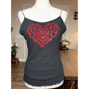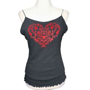 Rare Y2K Charlotte Russe cami top featuring a red glitter floral heart design on soft black stretch knit. Finished with delicate spaghetti straps, a satin-feel back panel, and a ruffled lettuce hem for that early-2000s coquette-grunge vibe. Perfect for layering or pairing with low-rise jeans or a mini skirt.