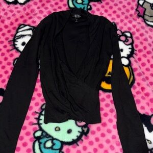 Chic black blouse with a stylish draped front. Long sleeves for a sleek look. Perfect for versatile styling.