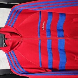 Stylish Adidas track jacket. Features bold red and blue colors. Perfect for casual wear