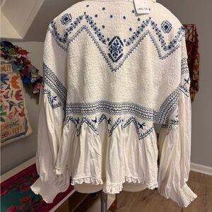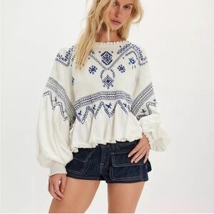 NWT Free People Holly Embroidered Smocked White and Blue Women's Top - large