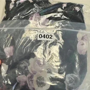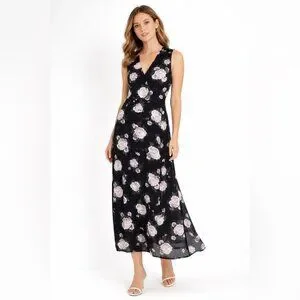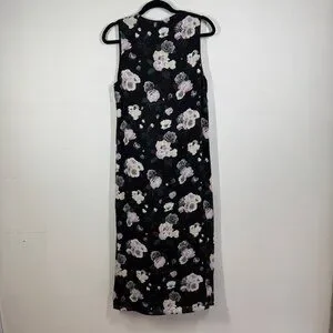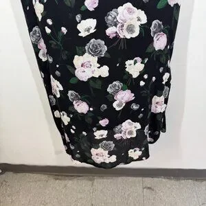 • Sleeveless design, V-neckline, slip-on style, slit, black base with soft pink, white, and grey floral print