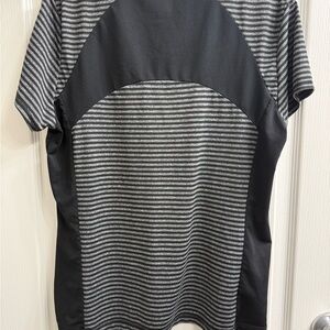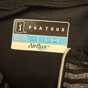 PGA TOUR Airflux performance golf top in black and gray stripe pattern.