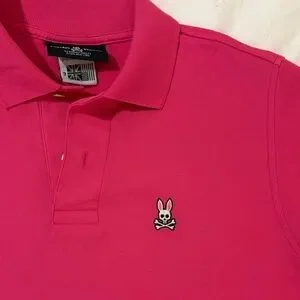 Vibrant polo shirts in lavender, green, and fuchsia. Features playful embroidered logo. Perfect for any occasion. One was used once and two were never used. Size 3 equals a Small. Get all 3 for less than the price of one.