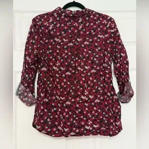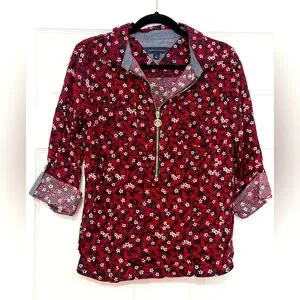 Tommy Hilfiger Red Floral Quarter Zip Top Roll Tab Sleeve Women’s size Medium