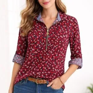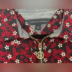Classic Tommy Hilfiger floral quarter-zip top in women’s size medium. A vibrant red micro-floral print with signature logo zipper pull and roll-tab sleeves for versatile styling. Lightweight and comfortable. Good condition. No stains, holes or piling.