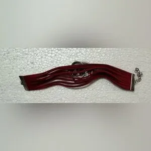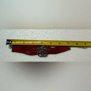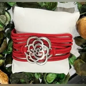 Stylish red leather bracelet featuring a silver floral accent. Perfect for adding a pop of color to any outfit.