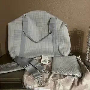 Elegant gray neoprene bag with textured design. Ideal for gym or travel.