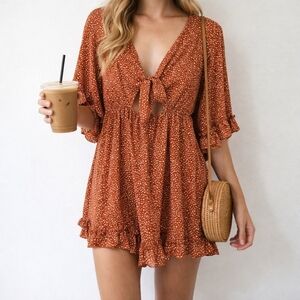 Size small, new without tags. Rust orange polka dot romper with tie front, flutter sleeves, and ruffle hem. 100% polyester.