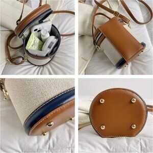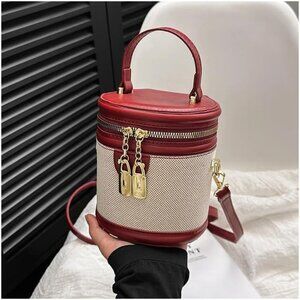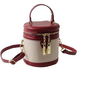 Features: Stylish cylindrical shape crafted from durable canvas and faux leather, this bag features a top handle and a detachable shoulder strap for multiple ways to carry. Secure zipper closure keeps your essentials safe, while interior pockets help organize your belongings. The gold-tone hardware adds a touch of elegance.