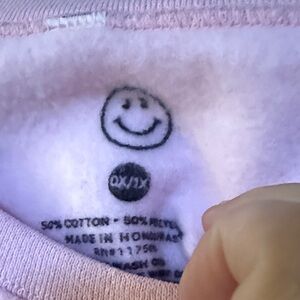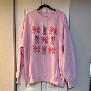 Charming pink sweater with bow and can graphics. Cozy crew neck design. *C2