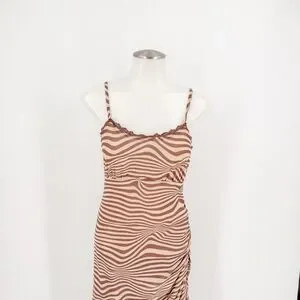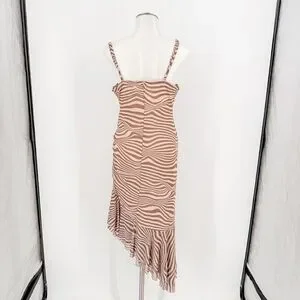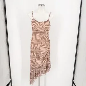 Chic asymmetrical dress with zebra stripes. Features spaghetti straps and flowing hem.