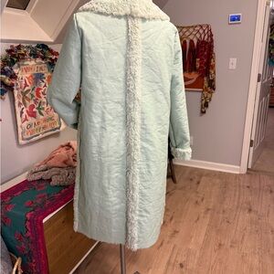 Elegant light mint green faux fur coat. Soft and luxurious texture. Pockets. Two button closure. Brand New. Missing belt.