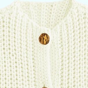 Cozy cream knit vest with wooden buttons. Features two front pockets.