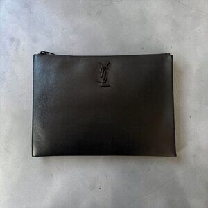 A sleek and modern Saint Laurent zip pouch crafted in signature grain de poudre textured leather with a striking monochrome YSL logo.