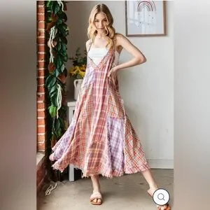 This relaxed, oversized cotton jumpsuit features mixed plaid patchwork panels, raw edged seams, and a mineral washed finish that gives it that perfectly lived-in boutique vibe. The deep V neckline and adjustable straps make it easy to layer over bralettes, tanks, or fitted tees.