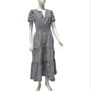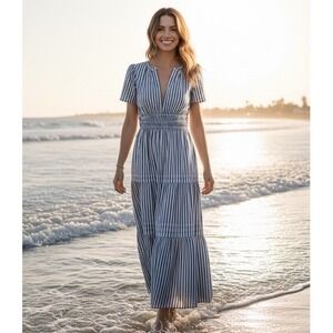 Quince Organic Cotton Tiered Maxi Dress Navy White Stripe Smocked Resortwear M