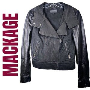 MACKAGE Andra Elevated Moto Biker Jacket Black Mixed Media Denim Leather, XS